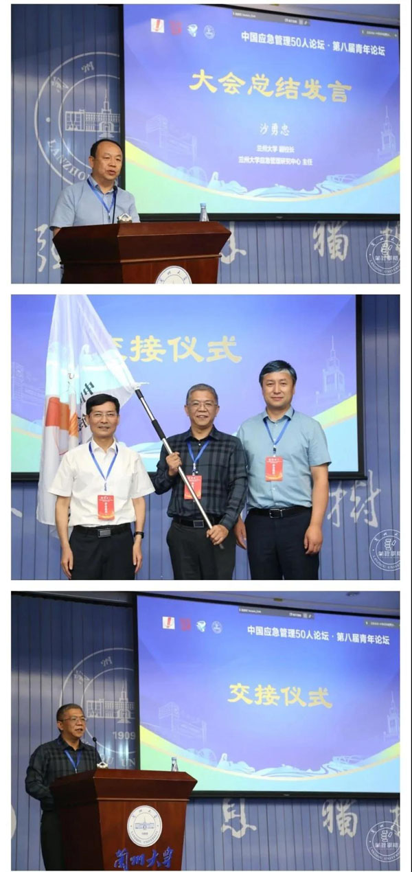 当天下午6点,论坛闭幕式举行。兰州大学副校长沙勇忠教授进行了会议总结,在肯定青年论坛的前沿性和敏锐的现实洞察力的同时,为青年学者的成长提出了殷切希望。兰州大学管理学院党委书记刘亚军与暨南大学公共管理学院副院长胡辉华教授进行了会旗交接仪式。胡辉华教授代表下一届承办单位暨南大学向与会学者,并通过他们向全国应急管理同行发出邀请。