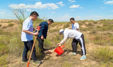 “绿水青山”团队在八步沙林场实地体验压沙植树工作