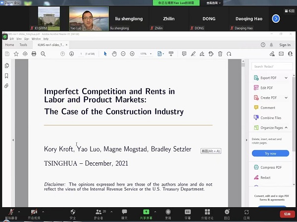 12月4日,清华大学公共管理学院政治与公共政策研究所第七期研究方法训练营活动通过线上会议成功举办。本期活动邀请到加拿大多伦多大学经济系罗耀副教授为大家讲授“Imperfect Competition and Rents in Labor and Product Markets: The Case of the Construction Industry”。活动由学院副教授刘生龙主持,政治与公共政策研究所所长刘志林,以及学院师生、博士后等30余人参加了会议。
