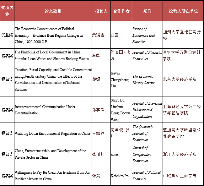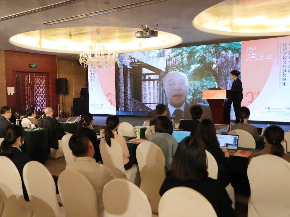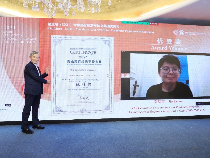 薛澜教授最后公布了第三届青木昌彦经济学论文奖优胜奖获奖论文——The Economic Consequences of Political Hierarchy: Evidence from Regime Changes in China, 1000-2000 C.E. 由加州大学圣地亚哥分校副教授贾瑞雪和香港中文大学白营副教授合作的论文。(文后附全部获奖论文名单)