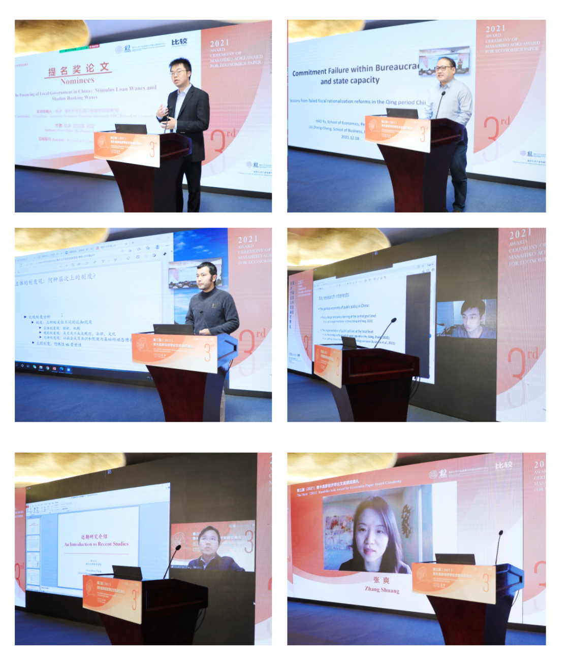 大家共同期待的现场奖项揭晓环节由清华大学文科资深教授、苏世民书院院长、青木昌彦经济学论文奖评审委员薛澜主持。薛澜首先公布了获得提名奖的论文名单和投稿人,清华大学五道口金融学院副教授陈卓、北京大学经济学院副教授郝煜、上海财经大学公共经济与管理学院助理教授孙宇锋分别上台接受颁奖和合影,现场授奖分别由梅赐琪、周黎安、《比较》杂志副主编吴素萍颁授。芝加哥大学哈里斯公共政策学院助理教授王绍达、浙江大学经济学院研究员张川川、美国科罗拉多大学副教授张爽在线接受颁奖并合影。