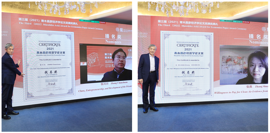 右三:青木昌彦经济学论文奖评审委员薛澜为第三届青木昌彦经济学论文奖提名奖获奖者张爽颁奖