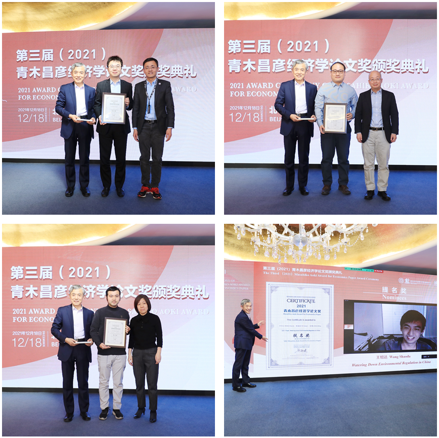 左三:青木昌彦经济学论文奖评审委员薛澜为第三届青木昌彦经济学论文奖提名奖获奖者张川川颁奖