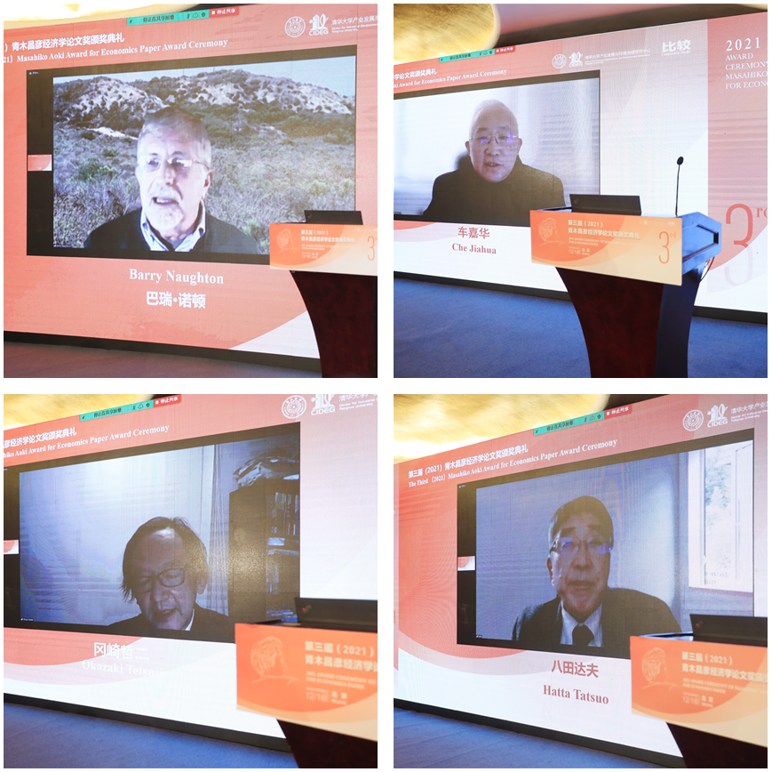 青木昌彦经济学论文奖评审委员:加州大学圣地亚哥分校巴瑞▪诺顿教授(左上)、亚洲成长研究所所长八田达夫教授(右下)、东京大学经济学部冈崎哲二教授(左下)、中欧商学院车嘉华教授(右上)分别发言