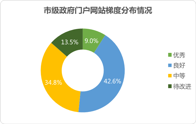 区县级政府门户网站中,13家网站位于“优秀”梯度,89家位于“良好”梯度。区县级政府门户网站梯度分布情况如下: