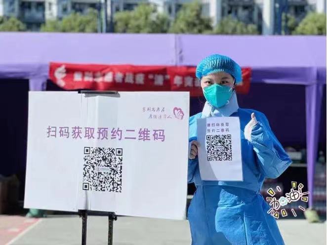 志愿者同学们经过简单培训后快速上岗,在每个点位分成入场引导、扫码登记两个工作组,认真投入工作。入场引导组的同学们手举二维码协调方便同学现场快速预约,一边时刻提醒检测同学“保持两米距离”,一边及时分流排队人群,保证检测效率;扫码登记组的同学们身着全身防护服与防护面罩,耐心逐一完成核酸检测二维码检验工作,保证录入检测信息无纰漏。