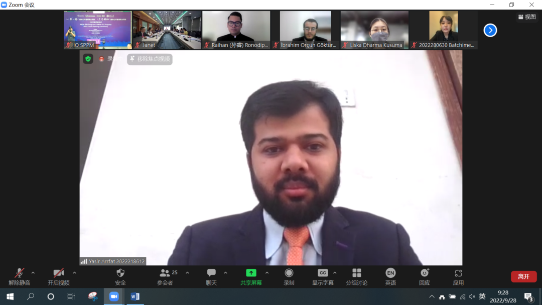 来自IMPA-BRI和IMPA-FL项目的学生代表分别发表感言。巴基斯坦籍新生、中巴经济走廊(CPEC)管理局能源专家阿思逸(Yasir Arrfat)代表IMPA-BRI项目新生发言。他首先向主办单位和公管学院表达了感谢。作为“一带一路”倡议重点项目的参与者和建设者,他在感到荣幸的同时也更感受到了努力学习的重要性。“三人行必有我师”,他期待同来自各领域、各地区的学员一起了解中国、学习中国经验,继续为中巴两国的友谊和全天候战略合作助力,共同促进“一带一路”项目建设。