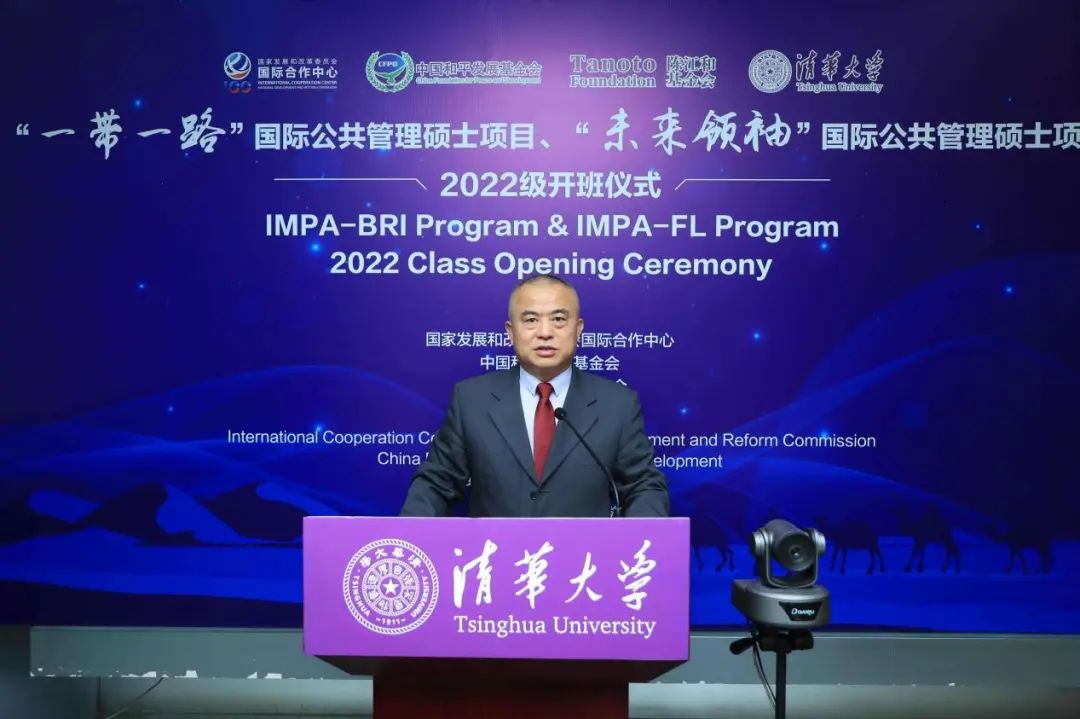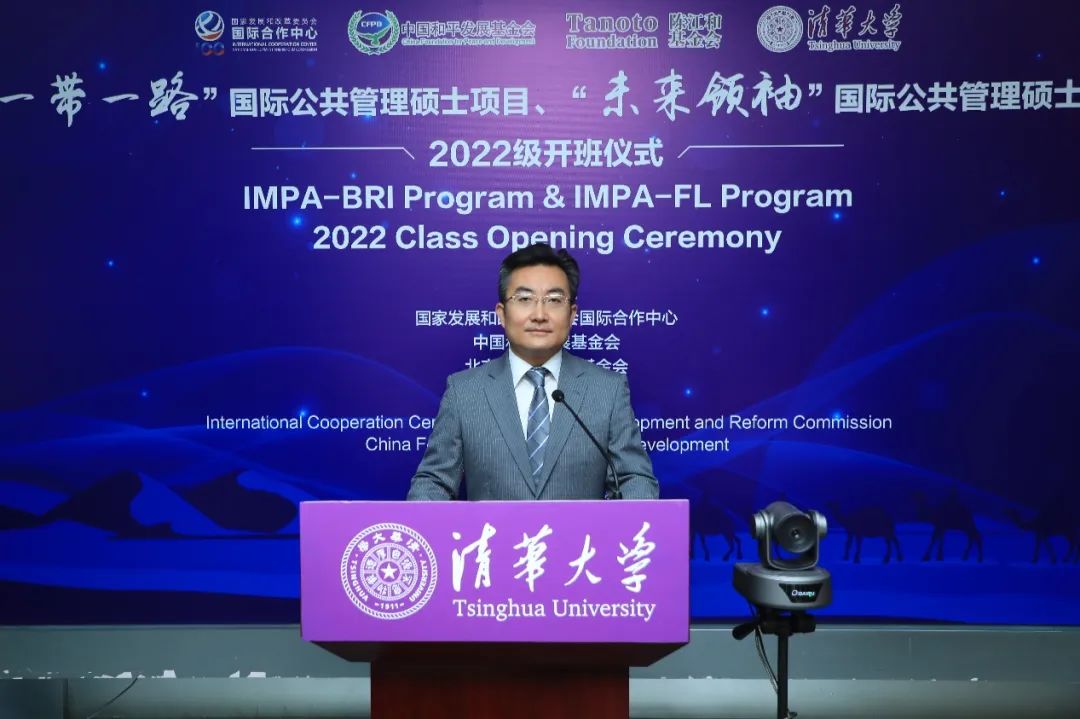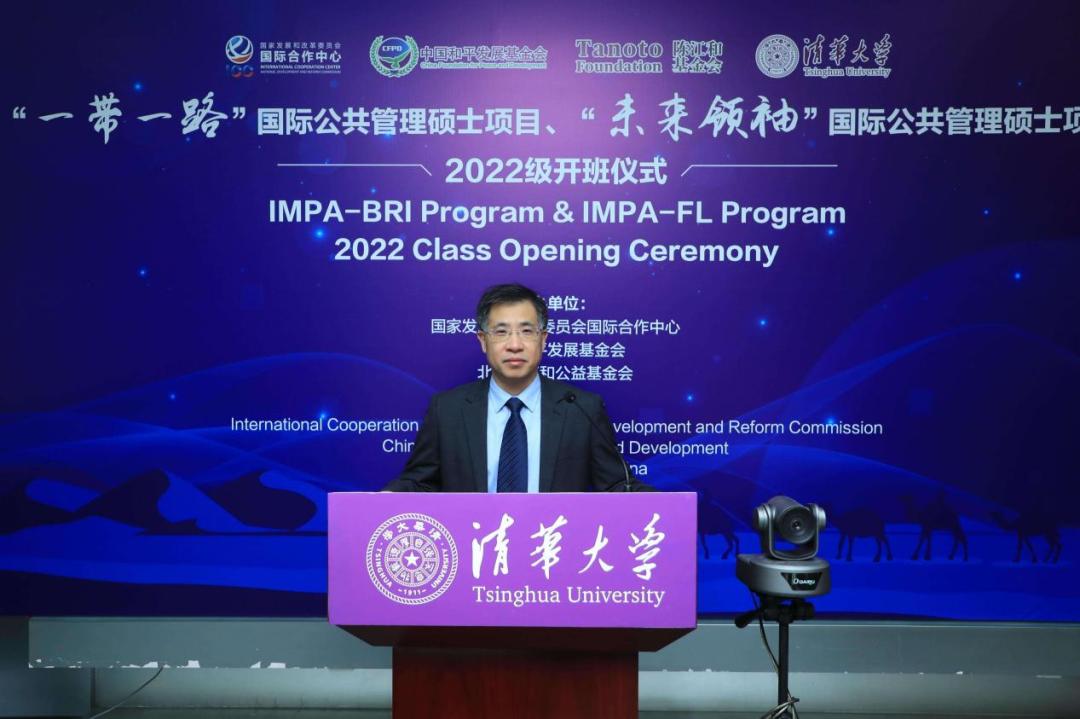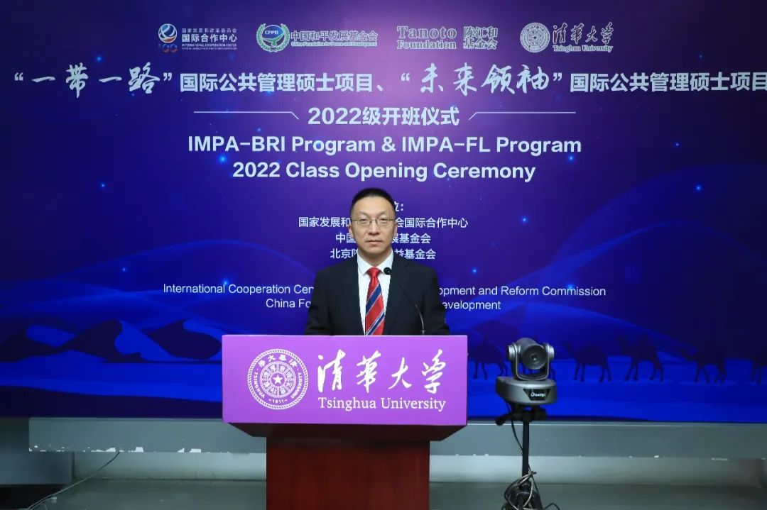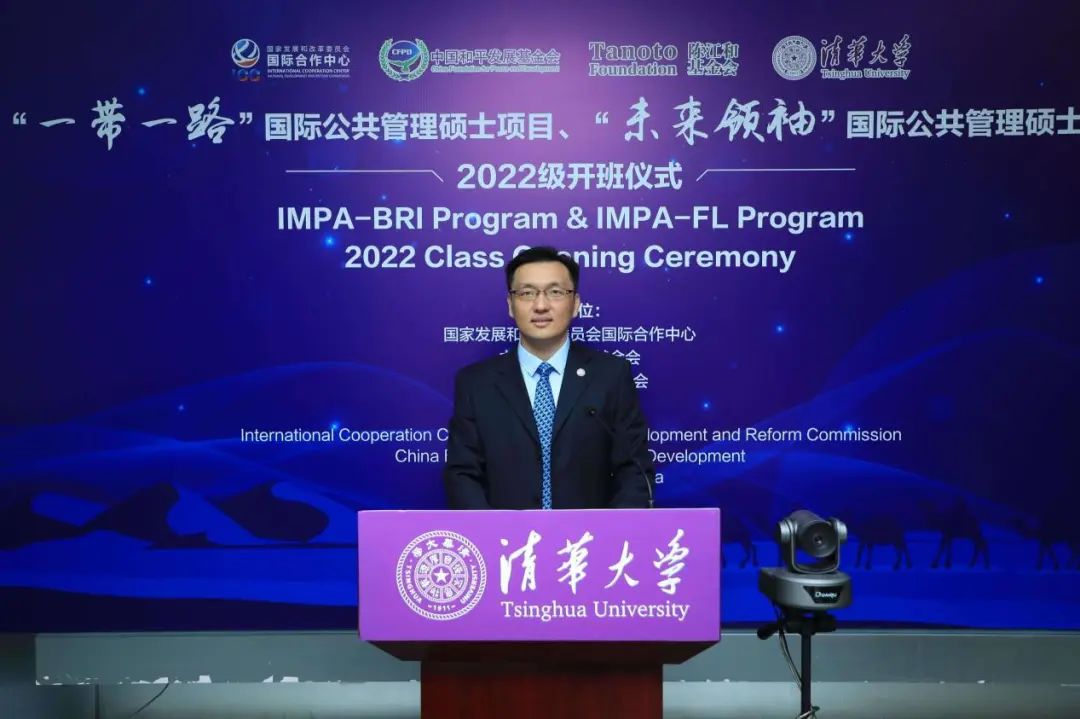 朱旭峰代表公管学院致辞。他首先向出席本次活动的各位嘉宾表示热烈欢迎,祝贺各位学员加入公管大家庭,并衷心感谢国家发展和改革委员会国际合作中心、中国和平发展基金会以及北京陈江和公益基金会对两个项目一如既往地支持。他指出,IMPA-BRI项目和IMPA-FL项目极具特色,一方面注重将公共管理学科的国际学术前沿成果与中国发展与治理经验的结合,另一方面注重学术理论与工作实践的协同培养,具有较高的战略意义。过去几年,两个项目均取得了不俗的成绩,很多学员毕业后都有了更好的发展,为推动中国与其母国的友好交流做出了重要贡献。与此同时,我们也应意识到,世界正在经历百年未有之大变局,这也对IMPA-BRI和IMPA-FL项目的发展以及学员的培养提出更高的要求。希望两个项目在主办单位的倾力支持和协助下,承续清华人和公管人的优良传统,继续强化学生学术能力的培养,拓展学生国际视野,助力学生更上一层楼。