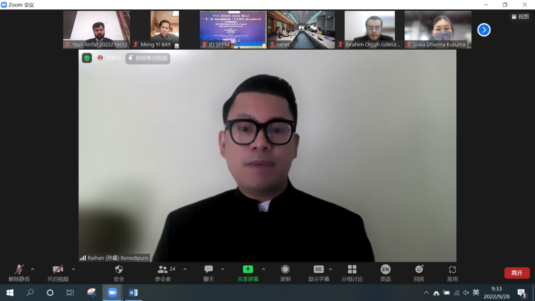 印尼籍新生、印度尼西亚共和国众议院特别助理孙睿(Raihan Ronodipuro)代表IMPA-FL项目新生发言。他曾经在吉林大学学习并获得了国际关系法硕士学位。在发言中,他首先感谢主办单位和清华大学提供的宝贵机会。在他看来,IMPA-FL项目是一条纽带,可以将来自世界各国的青年领袖和高级管理人才联系起来,大家互相学习、共同成长,助力构建人类命运共同体。他希望通过IMPA-FL项目这条纽带来提升自己,继续为中国印尼命运共同体的发展注入青年力量。