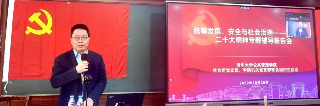 10月28日,清华公管学院社会组织与社会治理研究所党支部与机关党支部联合开展学习党的二十大精神组织生活,特邀学院党委书记、清华大学应急管理研究基地主任彭宗超,学院社会组织与社会治理研究所所长、清华大学公益慈善研究院院长王名两位教授为师生做主题为“统筹发展、安全与社会治理”的专题报告。线上线下共有50余位师生参加。会议由社会所党支部书记郑振清主持。