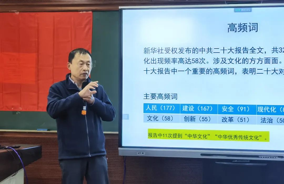 随后,线上及线下参会师生代表分享了学习体会。学院党委副书记兼副院长谢矜认为,报告中提到的马克思主义中国化、时代化新境界为我们坚定“四个自信”奠定了基础,并探讨了宗族文化在中国传统文化中的重要价值。学院学科规划办主任曹峰、副教授蓝煜昕、副教授蒙克分别从全面认识国家治理与安全的挑战、提升文化传播的策略与方法、秉持学术研究的定力、新发展格局与新安全格局的文化根基等方面分享了对党的二十大精神的学习感悟。图书馆主任刘五一分享了对于报告中新安全观的理解。学院科研办主任刘敏、党办主任陈蕾、国际合作与交流办公室主任徐臻,国际合作与交流办公室副主任、机关党支部书记史姝婷结合本职工作内容,分别从未来科研项目的申报方向、党委的安全任务落到实处、来华留学生管理与服务的工作要点、弘扬中华文化的具体途径等方面分享了学习心得。博士后路璐表示将在后续的研究中发掘中华文化的精华,探寻中华文化海外传播的有效途径。