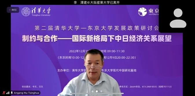 2022年12月10日,由清华大学国情研究院和东京大学现代中国研究基地联合举办的第二届“清华大学-东京大学发展政策研讨会”通过ZOOM举行。本届主题为“制约与合作——国际新格局下中日经济关系展望”。会议由清华大学公共管理学院教授、党委副书记,国情研究院副院长周绍杰,日本经济产业研究所客座研究员孟健军共同主持。
