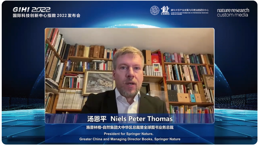 施普林格·自然集团大中华区总裁汤恩平(Niels Peter Thomas)博士指出,创新是经济增长和社会发展的关键引擎,国际合作对创新产出的支撑作用日益凸显,大量的国际合作集中在国际科技创新中心展开。他回顾并肯定了过去三年清华大学产业发展与环境治理研究中心与施普林格自然团队的合作历程和成效,他提到,指数报告在决策者和企业家中的影响力越来越大,希望未来能继续在此课题上与清华保持合作。