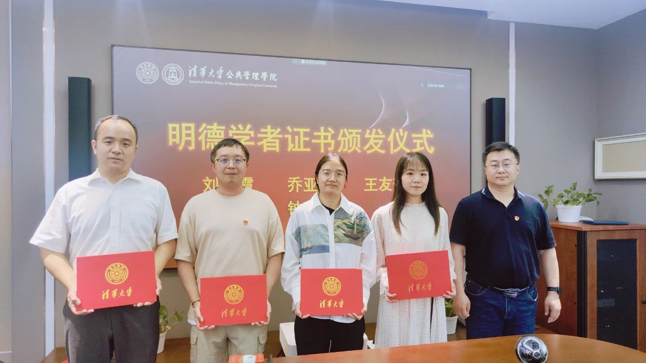 座谈会上还举行清华大学公共管理学院“明德学者”颁奖、清华大学公共管理学院博士后联谊会会长颁证仪式,周绍杰教授向获奖博士颁奖。明德学者名单:刘丹霞、乔亚丽、王友奎、许凯渤、钟晓萍,学院博士后联谊会会长名单:李守皓(上届),李尚翼(现任)。