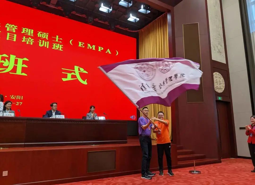 河南红旗渠干部学院常务副院长刘芳授班旗,清华大学EMPA香港政务人才项目学生代表耿春亚、EMPA香港公共治理项目学生代表廖珈奇共同接旗。