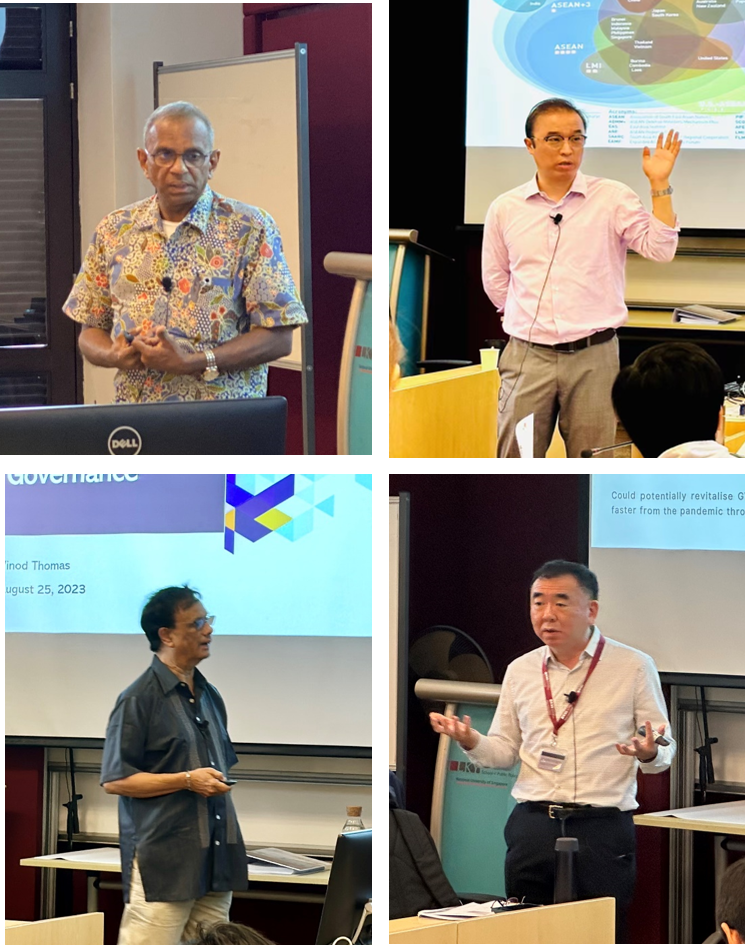 从左至右,从上到下分别是李光耀公共政策学院Manu Bhaskaran高级研究员、助理教授Ryu Yongwook博士、客座教授Thomas Vinod博士、高级研究员Denis Hew博士