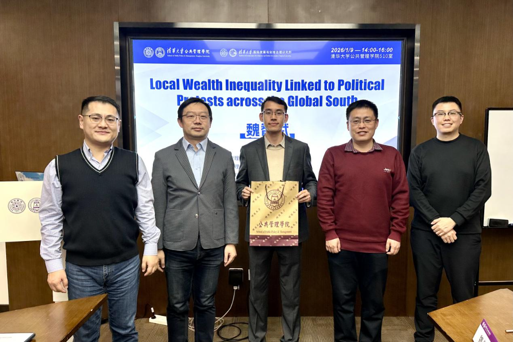 1月9日下午,清华大学公共管理学院“国际发展与全球治理系列讲座”在学院510会议室举行。剑桥大学利弗休姆青年研究员魏智武作题为Local Wealth Inequality Linked to Political Protests across the Global South的学术报告。本次讲座由清华公管学院副院长、国际所所长高宇宁副教授主持,陈济冬副教授、张鹏龙副教授担任点评嘉宾,魏文池副教授和龚璞副教授出席讲座,来自全校各院系三十余位师生参加了本次讲座活动。