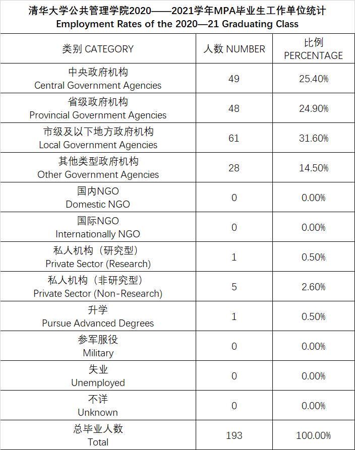 清华大学公共管理学院2020——2021学年MPA毕业生工作单位统计