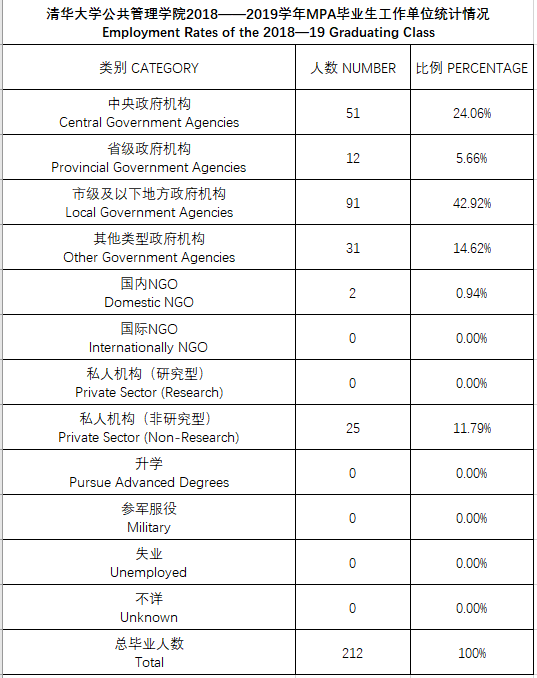 清华大学公共管理学院2018——2019学年MPA毕业生工作单位统计