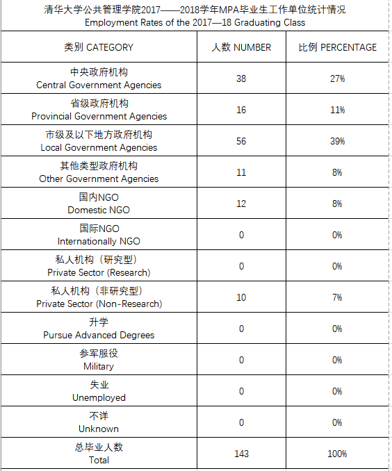 清华大学公共管理学院2017——2018学年MPA毕业生工作单位统计